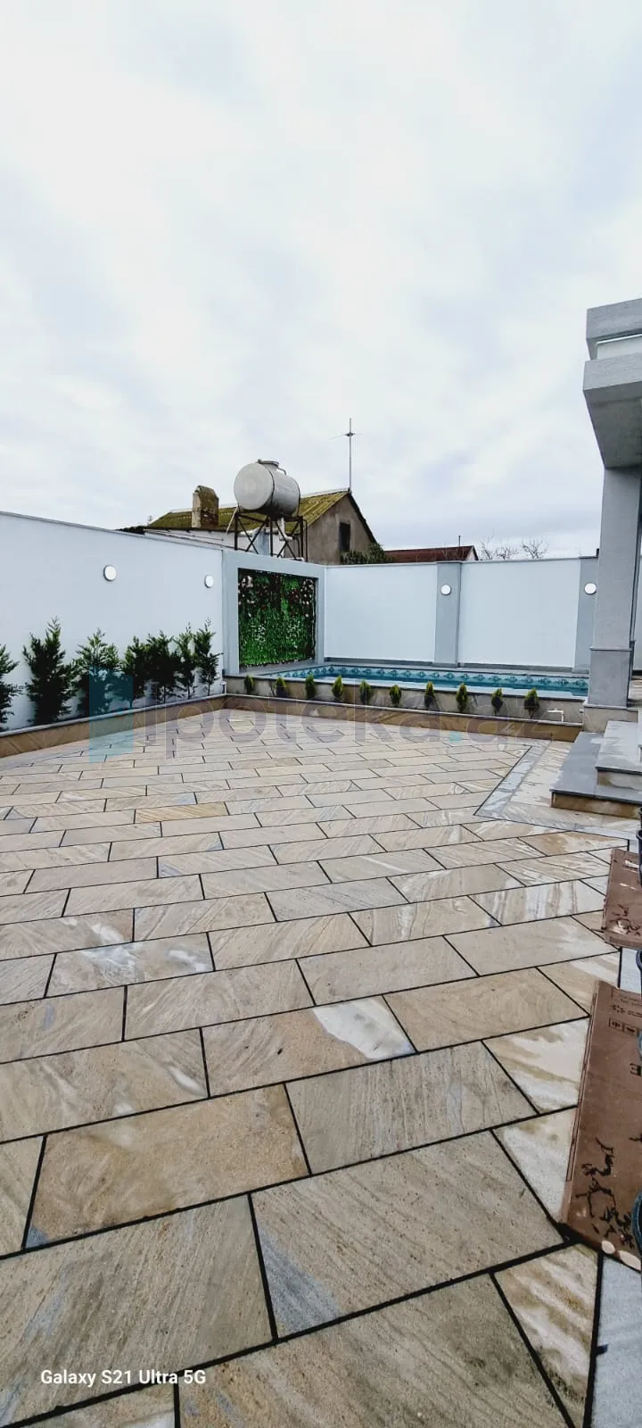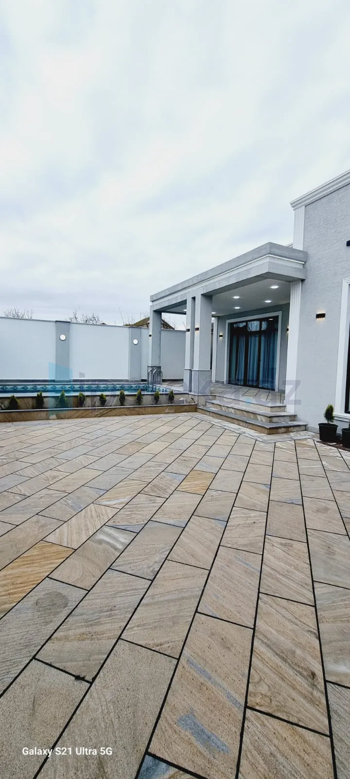 Həyətində filtirli hovuzu , verandası , dekorativ ağacları var..