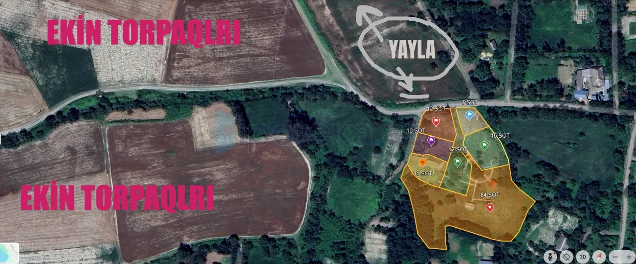 Şəki, Aşağı küngütdə Torpaq sahəsi tikinti təyinatlı olaraq hal-hazırda içində 96 m2-lıq çıxarışlı evi, 2 ədəd kottedji, 1 taxta anbar, 10 ədəd iri buynuzlu heyvan saxlamaq üçün tövləsi var. Torpaq sahəsində 13 ədəd boyu 15m-dən artıq bol bar verən qoz ağacları, 12 ədəd əzgil ağacı, gavalı, fındıq və heyva ağacları vardır. Sol tərəfim əkin torpaqlarıdır, qarşımdakı sahə isə yaylaya giriş. Torpağımın sağ hissəsində kənd başlayır. Ferma, istirahət mərkəzi və atçılıq mərkəzi tikilməsi üçün tam əlverişlidir. Suyu, qazı və işığı vardır, ərazimin içindədir. Barter maraqlıdır. Təkliflərə açığam. Daxili kredit notarial yol ilə mövcuddur.